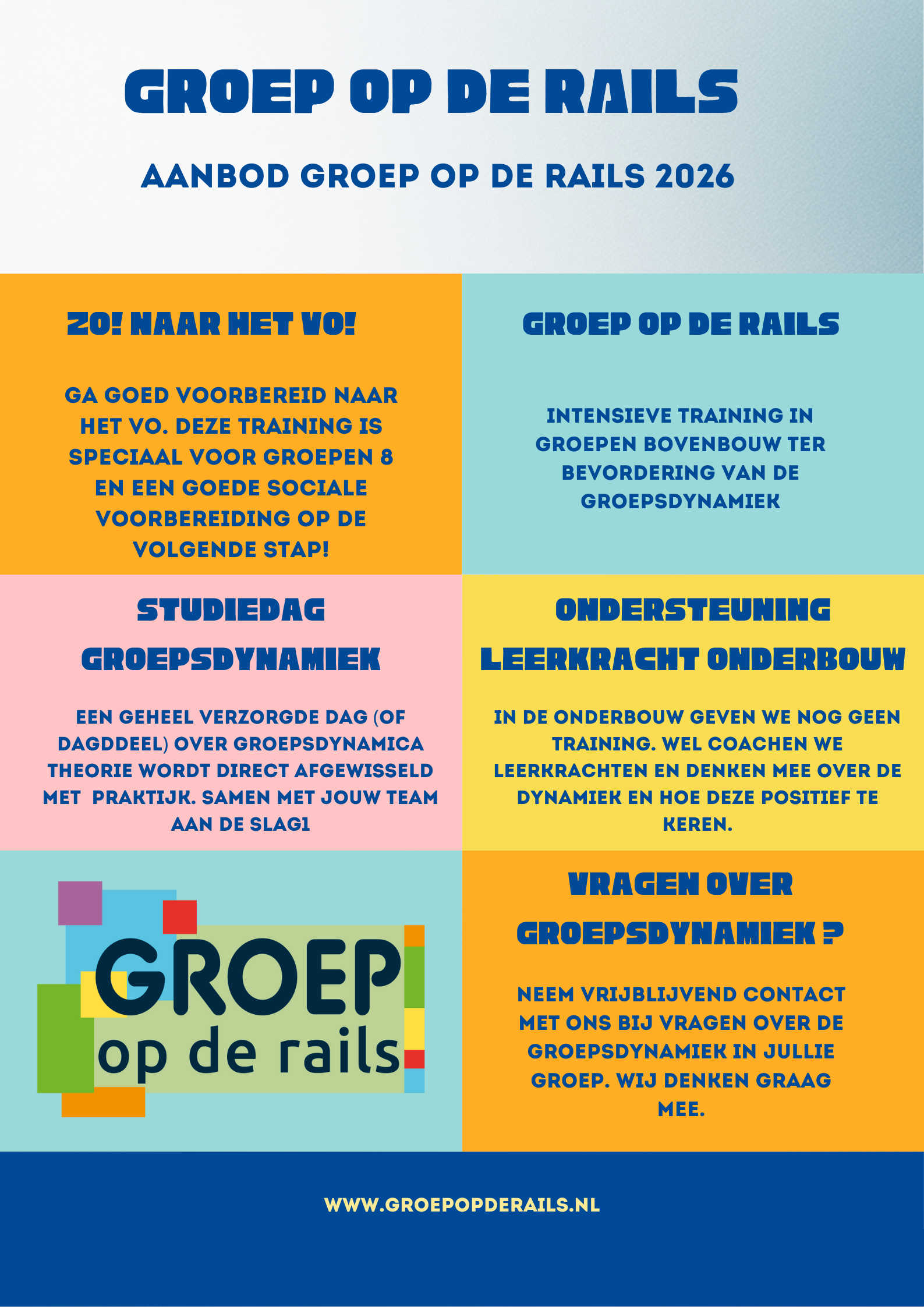 Steeds meer scholen en onderwijsorganisaties beschikken over een eigen academie. Voor leerkrachten die zich willen verdiepen in de methode Groep op de Rails, bieden wij inspirerende studiedagen vol praktische handvatten en direct toepasbare inzichten.